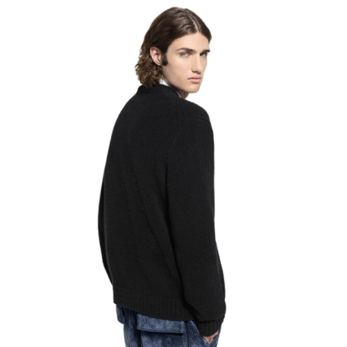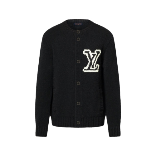 This contemporary collarless cardigan is crafted from chunky black yarn with a cozy hand-knitted effect, delivering laid-back style for effortless weekends. A contrasting LV is incorporated directly into the soft virgin wool-blend knit, lending a graphic accent to the chest. This piece makes a versatile layering option for the colder months.