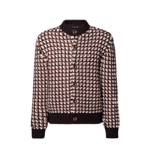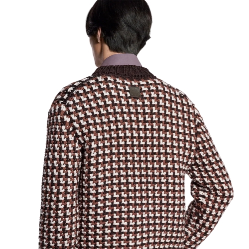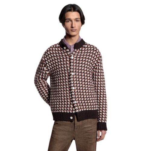 This wool cardigan with a chunky, crochet-like knit can be worn as a light outer layer. It features a graphic LV stitch in elegant brown tones and is adorned with sophisticated tiger’s eye-effect buttons. Embodying the Spring-Summer 2026 show’s relaxed elegance, it adds a refined accent to this season’s softly tailored ensembles.