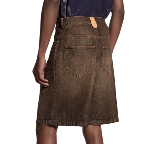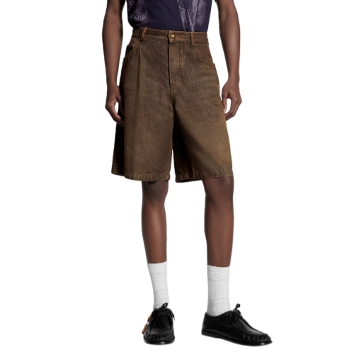 These casual denim shorts come in the Spring-Summer 2026 show’s iconic Coffee Indigo Denim. Their easy, pleated silhouette has a washed vintage finish, while yellow top-stitching and old-gold toned rivets recall the House’s trunk-making heritage. Signatures include a VVN-colored leather belt loop on the rear waist and discreet Louis Vuitton Paris embroidery on one pocket.