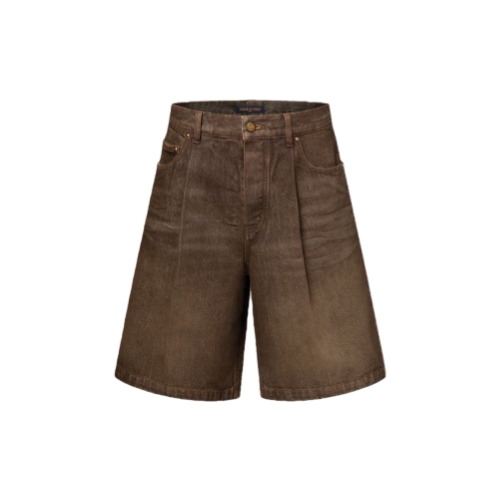 These casual denim shorts come in the Spring-Summer 2026 show’s iconic Coffee Indigo Denim. Their easy, pleated silhouette has a washed vintage finish, while yellow top-stitching and old-gold toned rivets recall the House’s trunk-making heritage. Signatures include a VVN-colored leather belt loop on the rear waist and discreet Louis Vuitton Paris embroidery on one pocket.