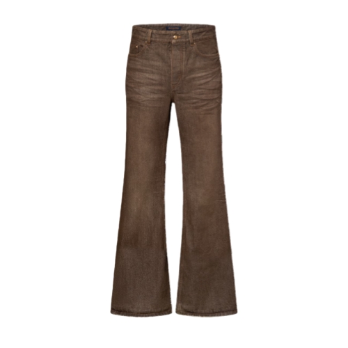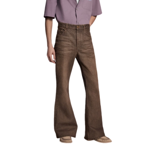 These flared organic denim pants come in the Spring-Summer 2026 show’s iconic Coffee Indigo Denim. They evoke the House’s trunk-making heritage with yellow top-stitching, old-gold toned rivets and a signed VVN-colored leather belt loop on the rear waist. These pants have a washed vintage finish and can be styled with a matching shirt.