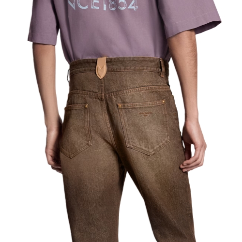These flared organic denim pants come in the Spring-Summer 2026 show’s iconic Coffee Indigo Denim. They evoke the House’s trunk-making heritage with yellow top-stitching, old-gold toned rivets and a signed VVN-colored leather belt loop on the rear waist. These pants have a washed vintage finish and can be styled with a matching shirt.