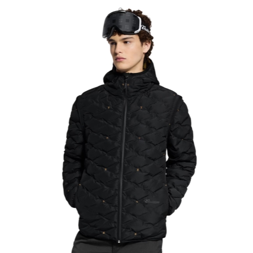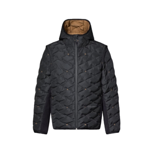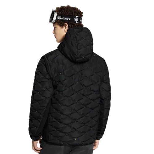 Designed for the outdoors, this hooded down blouson is a versatile light outer layer that converts into a vest with its detachable sleeves. Malletage quilting recalls the interiors of Louis Vuitton trunks while jersey panels under the arms provide ventilation. Printed mini LV and Monogram Flower signatures in a burnished caramel hue accent the quilting, with the colors reversed on the lining.