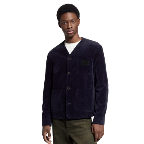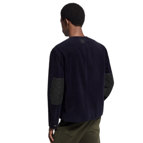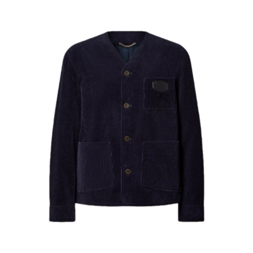 This elegant jacket tailored from midnight blue corduroy is inspired by the British countryside. It has a softly structured, workwear-influenced style with patch pockets and a collarless V-neck. Black leather signature patches, crafted with a mix of House signatures, accent the breast pocket, back and elbows. This refined piece lends subtle color and velvety texture to smart everyday looks.
