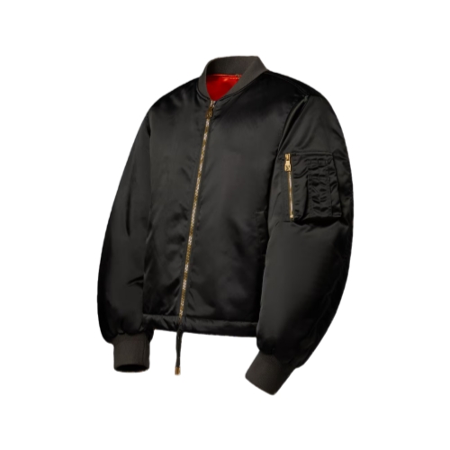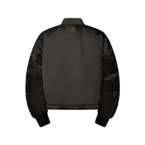 This sleek khaki green nylon bomber draws on rockabilly inspiration for the Fall-Winter 2025 collaboration between Pharrell and Nigo. It has a cropped fit with an adjustable drawstring waist creating an A-line silhouette when styled loose. The left arm has a handy zipper pocket, while the back is signed with a leather Marque L.Vuitton Déposée patch with golden 3D lettering.