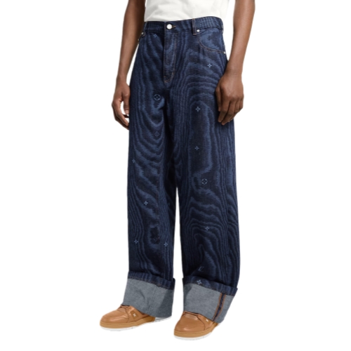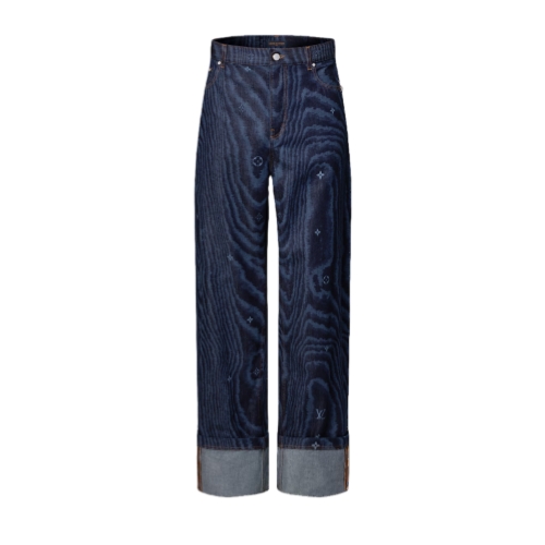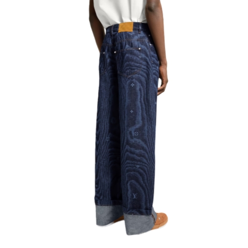 These standout denim pants are adorned with this collection’s graphic LV Moiré motif, which is printed to create a playful illusion of shimmering silk. Their easy skate silhouette, featuring deep turned-up cuffs, is accented with a Damier nubuck jacqueron and pearly rivets. Style with a matching double-breasted jacket for a fashion-forward take on the suit.