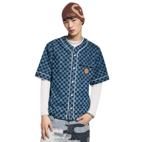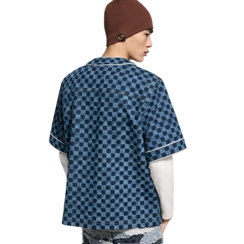 A summery essential, this short-sleeved denim baseball shirt has a breezy, relaxed fit. Crafted from organic cotton, it is elevated with a printed allover Miniature Damier motif while contrasting white piping and pearly buttons add a crisp accent. Topstitched chest pockets with rivets complete this versatile piece, which brings a graphic signature accent to everyday looks.