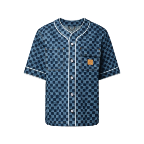 A summery essential, this short-sleeved denim baseball shirt has a breezy, relaxed fit. Crafted from organic cotton, it is elevated with a printed allover Miniature Damier motif while contrasting white piping and pearly buttons add a crisp accent. Topstitched chest pockets with rivets complete this versatile piece, which brings a graphic signature accent to everyday looks.