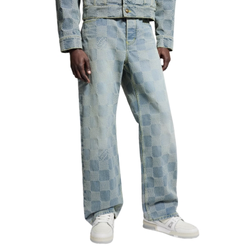 These effortless denim skate pants are elevated with a softly textured 3D Damier jacquard incorporating Marque L.Vuitton Déposée signatures. The washed indigo denim is embellished with yellow topstitching and aged gold-toned hardware, while a nubuck Damier jacqueron signs the waist. Easy to mix and match, these pants make a standout set with a corresponding jacket.