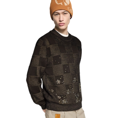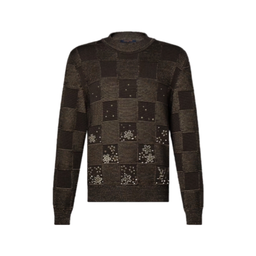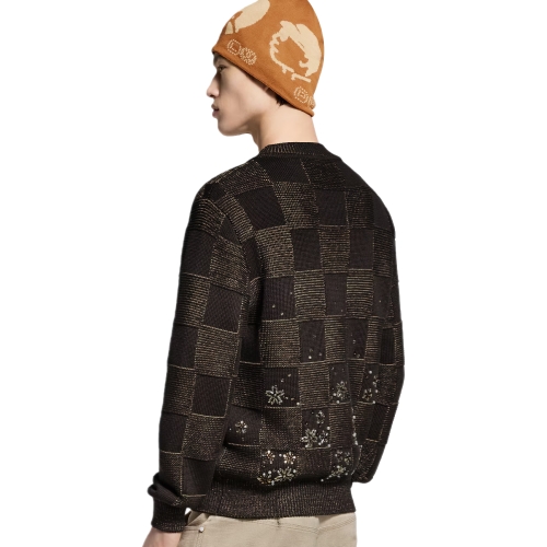 Crafted in a lustrous silk-cotton blend, this long-sleeved crewneck is a laid-back yet sophisticated piece for evenings. Drawing on the Fall-Winter 2025 show’s cherry blossom theme, it features a chunky-knit tonal allover Damier motif, which is embroidered with jewel-like rhinestone flowers in a gradient effect. An ornamental Pearl LV Cherry Blossom signature is embroidered above the bottom left hem.