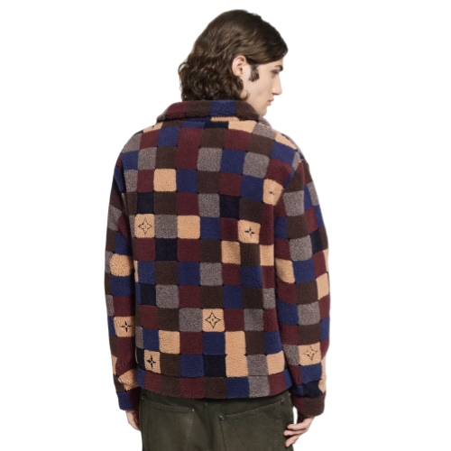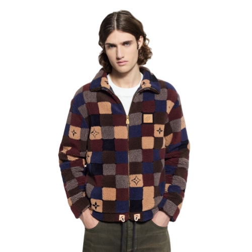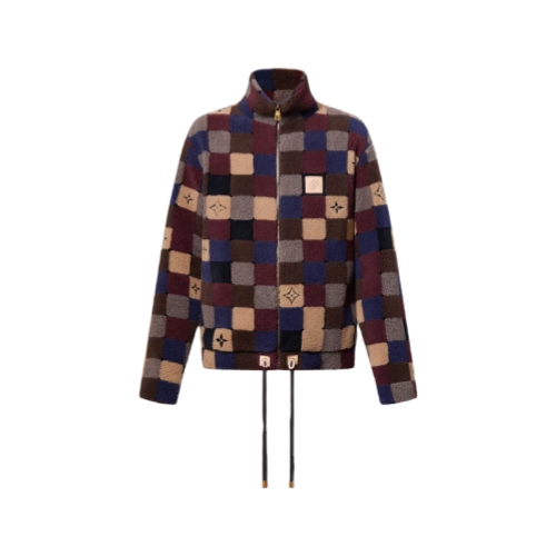 This warm fleece zip-up blouson combines seasonal comfort with a graphic signature style. It features a Damier Pixel jacquard motif incorporating Monogram Flower signatures in earthy brown and blue tones. A tall collar keeps the neck warm, while VVN-colored leather adjusters adorn the drawstring waist. A VVN-colored leather Marque L.Vuitton Déposée patch signs the chest.