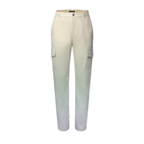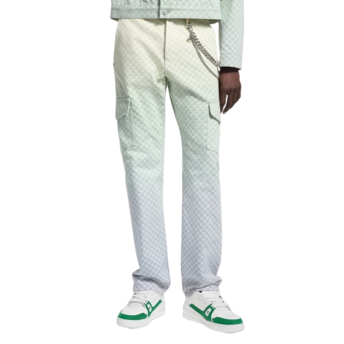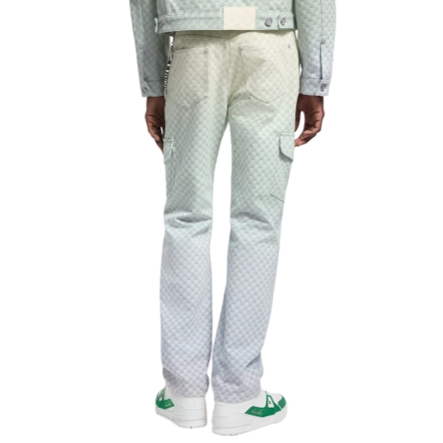 These summery denim cargo pants are crafted from a sophisticated jacquard gradient Damier that subtly transitions from pale green to delicate lilac hues. A white nubuck Damier jacqueron and a pearlescent button and rivets add a dandy accent to this fashion-forward piece, which can be paired with a matching jacket for a total look.