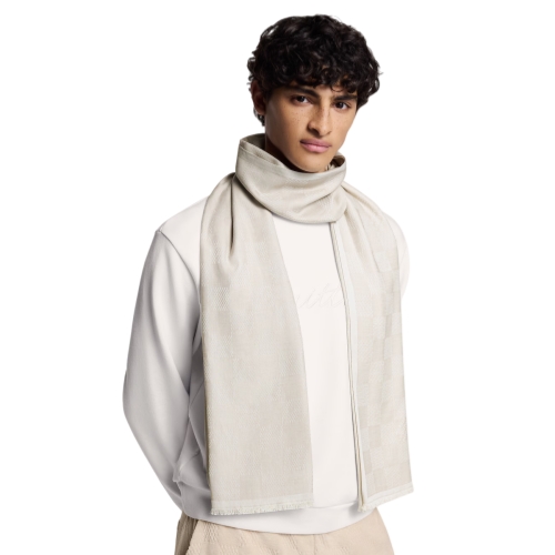 A lightweight layer that is perfect for temperatures transitioning into warmer months, the Damier Heritage stole interprets the classic checkerboard signature in a moody palette that adds romance. A corner is outfitted with the Marque Louis Vuitton Déposée signature, and dimension and texture come courtesy of a fringed hem.