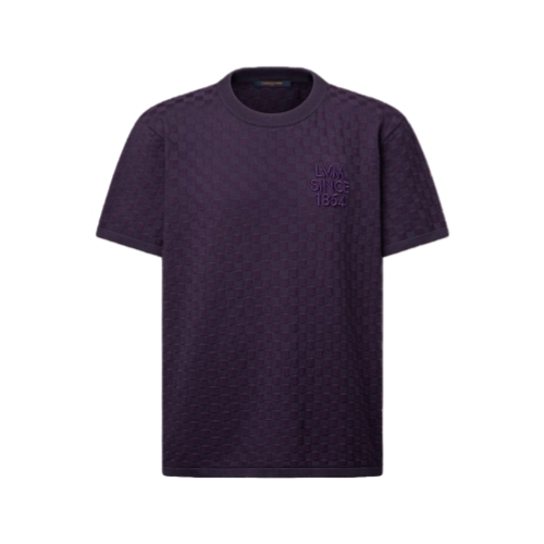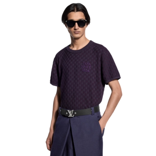 This short-sleeved cotton crewneck features a textured allover Damier knit in the season’s deep purple tones. A tone-on-tone embroidered LV Alphabet signature accents the chest, while a leather Marque L.Vuitton Déposée patch signs the back. This understated design lends a discreet yet sophisticated touch to everyday looks.