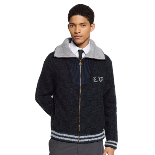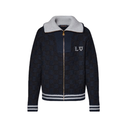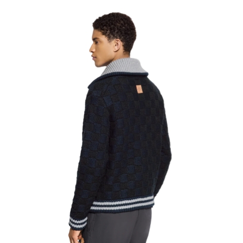 This cotton-wool blend cardigan has a cozy zip-up collar to keep out the cold. The chunky black yarn is knitted into a textured Damier that contrasts with the pale gray collar and striped cuffs and waist. An embroidered LV adorns the chest, while a VVN-colored leather patch signs the back. This piece has a substantial quality, making it an attractive winter layering option.