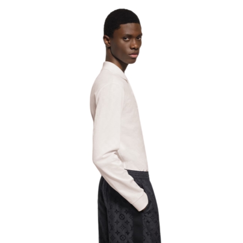 This elegant white long-sleeved polo shirt is distinguished with a tone-on-tone Damier motif in a fine cotton piqué knit. It is adorned with three delicate mother-of-pearl effect buttons and an embroidered Marque L.Vuitton Déposée on the chest. This icon of the men’s ready-to-wear wardrobe lends a preppy signature accent to everyday looks.