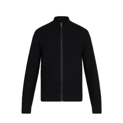 This casual zip-through piece spotlights the House's Damier signature - a key theme this season. The pattern is reinterpreted as a textured motif, on a knit crafted from the House's exclusive Louis Vuitton Pont Neuf yarn, RWS-certified as animal- and environment-friendly. Signed at the side with an engraved Louis Vuitton staple, it is available in the season's featured navy, gray and black colorways.