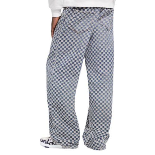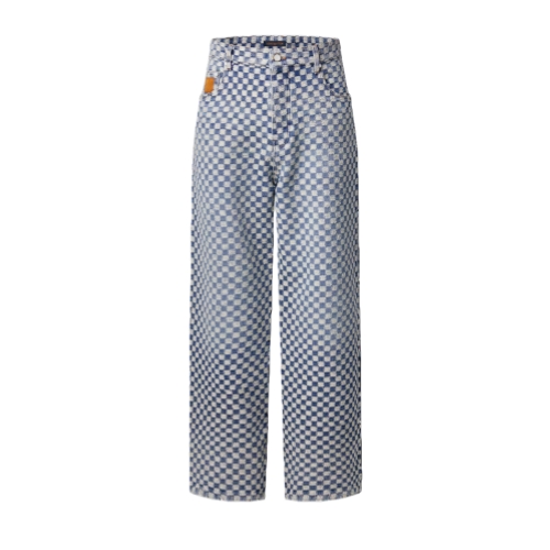 These wide-leg jeans from the Fall-Winter 2025 collection are elevated with an allover Mini Damier pattern. Embroidered in contrasting white thread, the graphic motif brings a softly textured finish to the washed organic denim base. Pearly rivets adorn the pockets, while a nubuck Mini Damier jacqueron signs the back of this summery signature style.