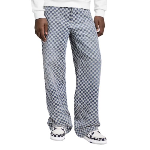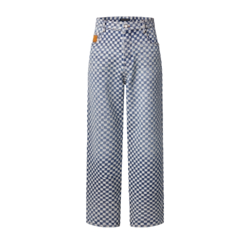 These wide-leg jeans from the Fall-Winter 2025 collection are elevated with an allover Mini Damier pattern. Embroidered in contrasting white thread, the graphic motif brings a softly textured finish to the washed organic denim base. Pearly rivets adorn the pockets, while a nubuck Mini Damier jacqueron signs the back of this summery signature style.
