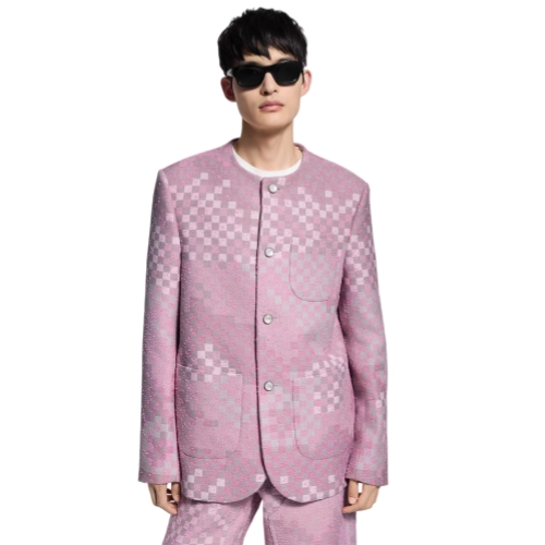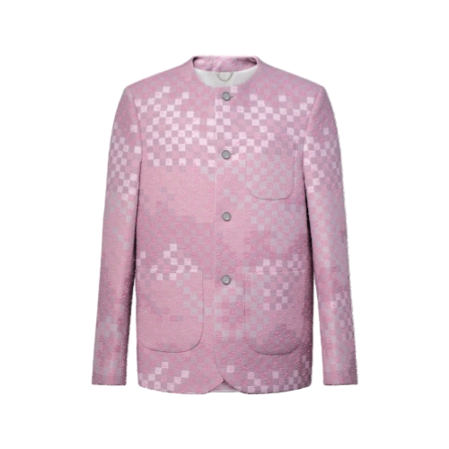 This elegant collarless jacket showcases the iconic pink Damoflage Sakura motif from the Fall-Winter 2025 show. Textured pink yarn accents the jacquard tweed, calling to mind the cherry blossom that inspires this collection. A leather Marque L.Vuitton Déposée patch signs the back of this richly worked, silk-lined piece, which brings a dandy sartorial accent to a summery ensemble.