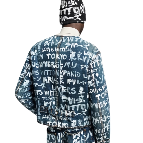 This denim jacket from the Fall-Winter 2025 show’s Pharrell and Nigo collaboration is printed with a graphic LV Scribble motif merging calligraphic traditions from Nigo’s native Japan with Western street art. The white "hand-painted" lettering incorporates House signatures in Japanese alongside references to Paris and Tokyo. The elegant collarless silhouette has a quilted lining and patch pockets with rivets. Pair with matching pants for a runway look.