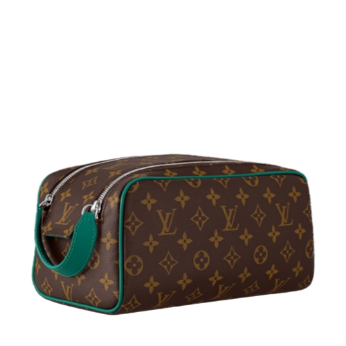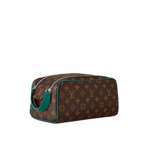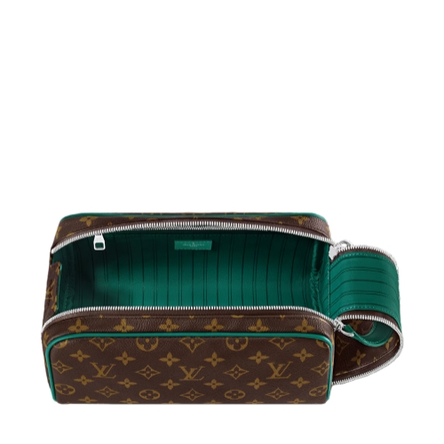 Sturdy and practical, the Dopp Kit in Monogram Macassar coated canvas is adorned with colored piping and colored leather on the handle attached to the double zipper. Designed for storing grooming essentials and toiletries, it has a washable lining in the same color as the color of the exterior details.