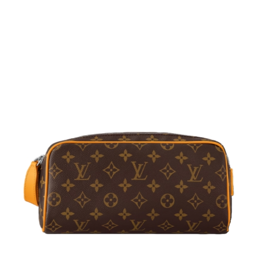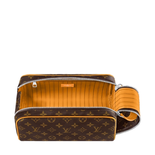 Sturdy and practical, the Dopp Kit in Monogram Macassar coated canvas is adorned with colored piping and colored leather on the handle attached to the double zipper. Designed for storing grooming essentials and toiletries, it has a washable lining in the same color as the color of the exterior details.