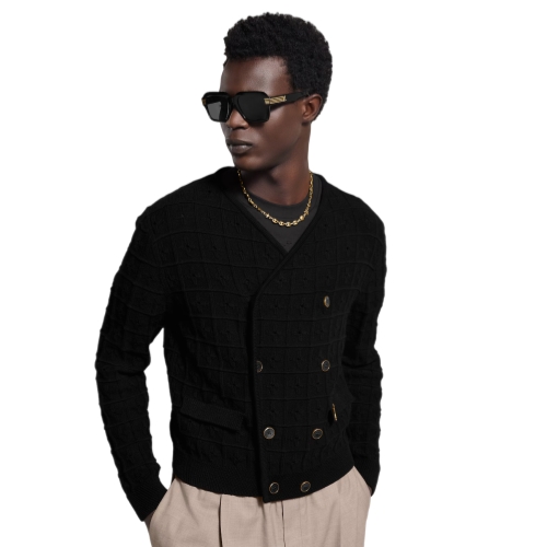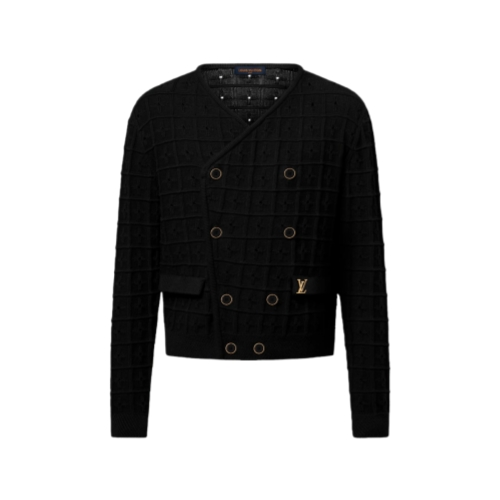 This chic black cotton cardigan is inspired by this collection’s dandy as he embarks on a cruise. The double-breasted silhouette features a crochet-style textured cotton knit incorporating a Monogram Flower motif with delicate eyelet holes. A golden metal LV ornament accents the left pocket. A sophisticated layer for summery day-to-evening looks.