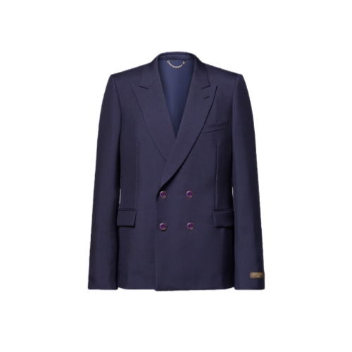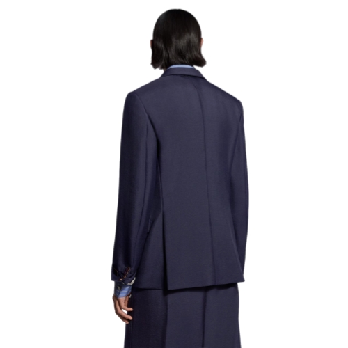 This elegant double-breasted jacket in vibrant purple indigo tones is inspired by the Spring-Summer 2026 show’s Indian Dandy. The sharp, minimalist silhouette is tailored in fine mohair with sartorial details including a striped lining to the sleeves, while a brown leather Louis Vuitton Paris patch signs the left arm. Matching pants make a chic suit.