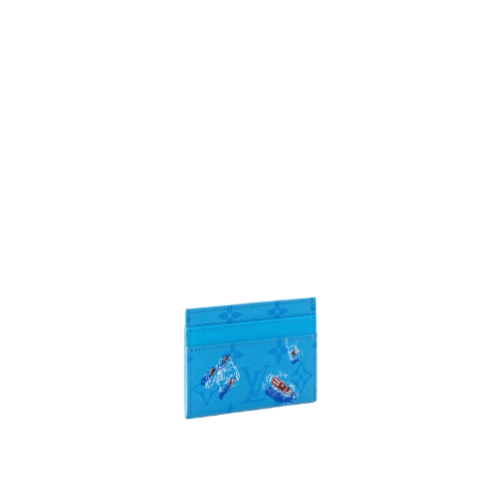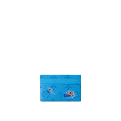 The Double Card Holder is crafted from colored Monogram canvas, featuring a print of a miniature sports scene. The playful image adds a whimsical touch to this classic accessory. The interior is lined with cowhide leather and offers four card slots along with a central pocket for smaller essentials.