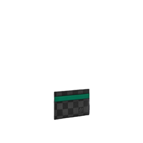 Made from Damier Graphite coated canvas, the Double Card Holder features a bold touch of green cowhide leather for contrast. This refined accessory includes four card slots and a central pocket, ideal for smaller items. Its craftsmanship and subtle colorway bring understated style to a practical piece.