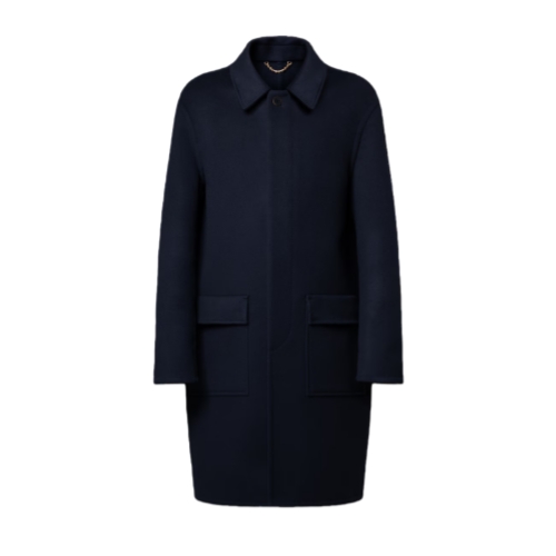 This navy blue car coat is a refined and versatile piece for completing a wide range of looks. It is crafted from luxuriously soft wool-silk blend double-face fabric with an allover LV Blason jacquard on the interior, while a leather Marque L.Vuitton Déposée patch signs the back. A shirt-style collar and large flap pockets create a mood of easy elegance.