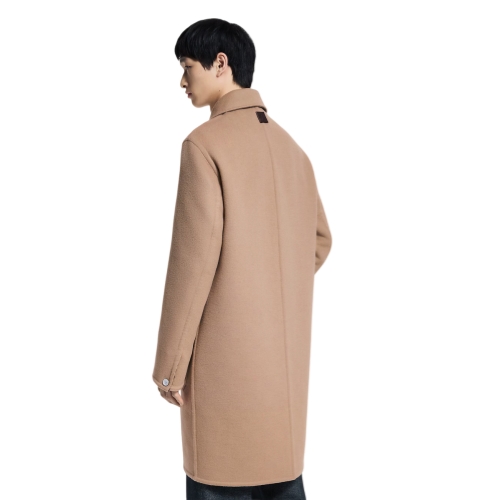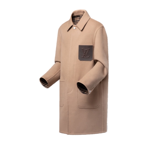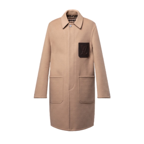 This versatile beige car coat is tailored from a soft and luxurious wool-silk blend double-face fabric with a jacquard Vichy Damier Seeds motif on the inside. Signature accents crafted in leather include an LV-embossed pocket on the chest and a Marque L.Vuitton Déposée label on the back. Generous patch pockets create a mood of easy elegance.