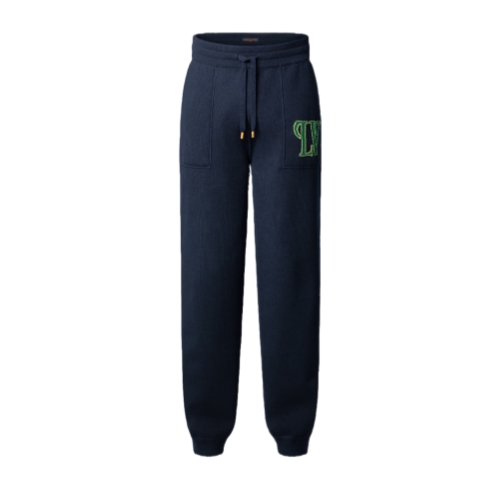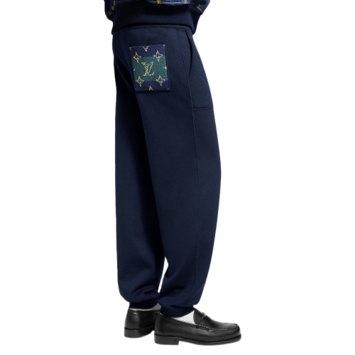 These smart navy blue jogging pants combine elegance with comfort. The double-face wool-cotton blend jersey incorporates a contrasting intarsia LV signature on the left pocket and this season’s sporty Monogram Heritage motif on the rear patch pocket. A soft ribbed drawstring waistband and cuffs make this a perfect piece for lounging. A matching hoodie makes a standout set.