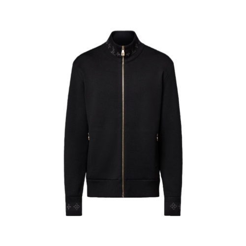 Combining comfort with elegance, this black wool-blend blouson is crafted in a sophisticated double-face knit with a soft cotton interior. The minimalist silhouette is accented with jacquard Monogram details on the collar and cuffs, which remain visible when layered under a coat or jacket. Matching pants make a smart travel set.