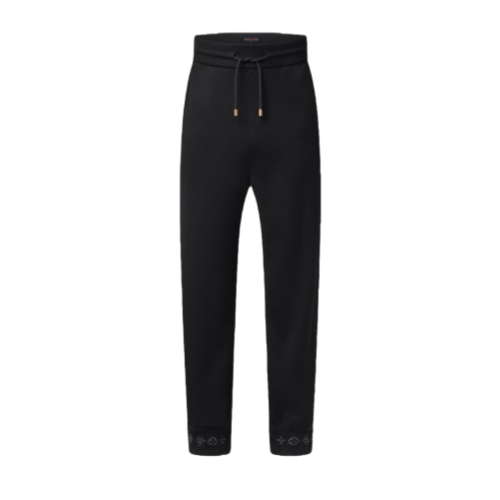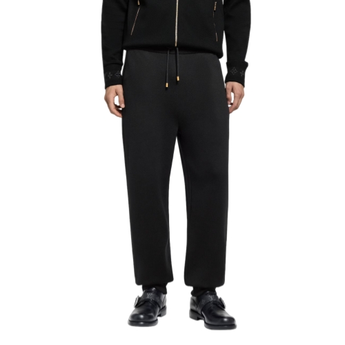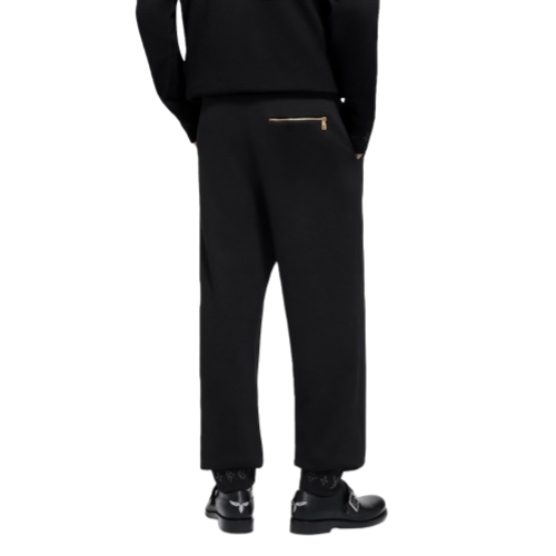 Combining comfort and elegance, these black wool-blend pants are crafted in a sophisticated double-face knit with a soft cotton interior. Their minimalist silhouette, which is distinguished with jacquard Monogram signatures on the cuffs, makes a smart travel set when paired with a matching blouson.