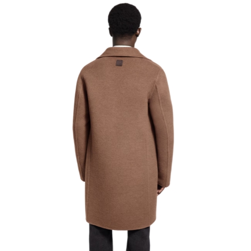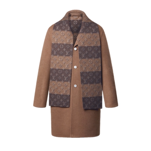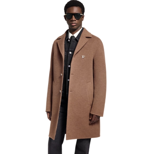 This double-face coat in a luxurious blend of wool, cashmere and silk is a versatile caramel brown on the outside, while this collection’s preppy Monogram Heritage motif adorns the jacquard interior and removable scarf. Cut with a relaxed fit, this softly structured everyday piece is embellished with a jewel-like LV ornament on the chest and mother-of-pearl effect buttons.