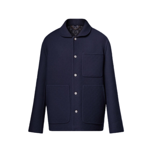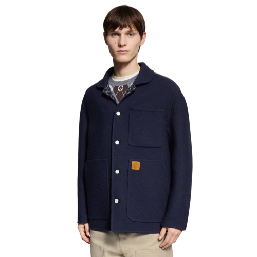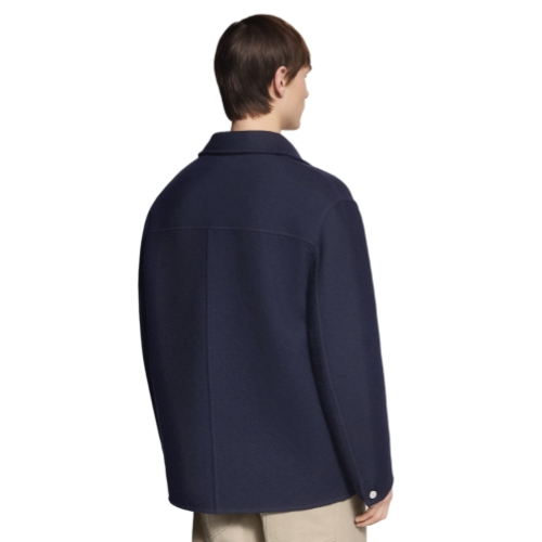 This timeless navy blue jacket from the Fall-Winter 2025 show has a softly structured workwear silhouette crafted from double-face wool. A contrasting jacquard featuring this collection’s Dandy Monogram adorns the interior while a rounded collar and pearl-effect buttons add chic accents. This light and effortlessly elegant piece complements a wide range of everyday looks.