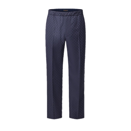 These draped navy blue drawstring pants are tailored from pure wool and adorned with a graphic allover LV Fishnet jacquard. The tone-on-tone motif consists of interlocking LV signatures creating a beautifully lustrous mesh effect. These pants make an effortlessly elegant suit paired with a matching Napolitana jacket.