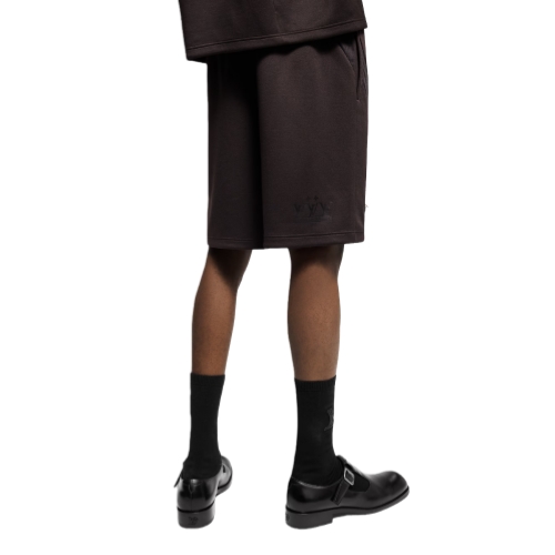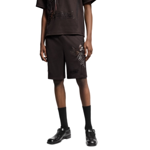 These dark brown drawstring shorts inspired by the Spring-Summer 2025 show’s soccer theme are a sophisticated reinterpretation of a casual silhouette. The technical cotton jersey, featuring sporty mesh inserts, is elevated with printed tone-on-tone signatures, while rhinestone crystals and gleaming beaded floral embroidery adorns the legs. A matching top makes a chic set.