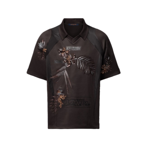 This dark brown v-neck t-shirt inspired by the Spring-Summer 2025 show’s soccer theme elevates a sporty silhouette with Louis Vuitton savoir-faire. Crafted from technical cotton jersey with mesh inserts, it is adorned with printed tone-on-tone signatures, while rhinestone crystals and gleaming beaded floral embroidery adorn the front and sleeves. Matching shorts make a casual yet sophisticated set.
