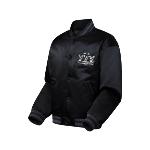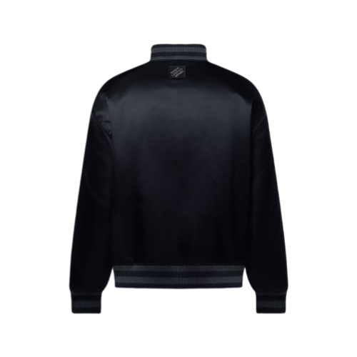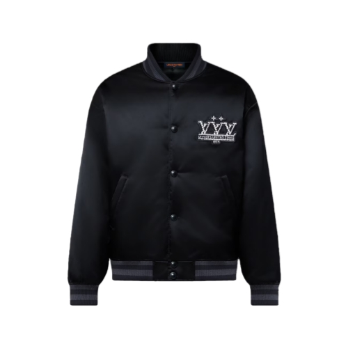 Crafted from lustrous technical canvas, this lightly padded black baseball jacket strikes a sophisticated note with rhinestone-encrusted signatures. A glittering LV Vers United patch from the Spring-Summer 2025 show is emblazoned across the chest, while a smaller LV adorns the back. This versatile piece is easy to mix and match with casual and everyday looks.