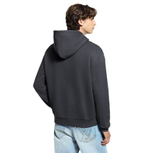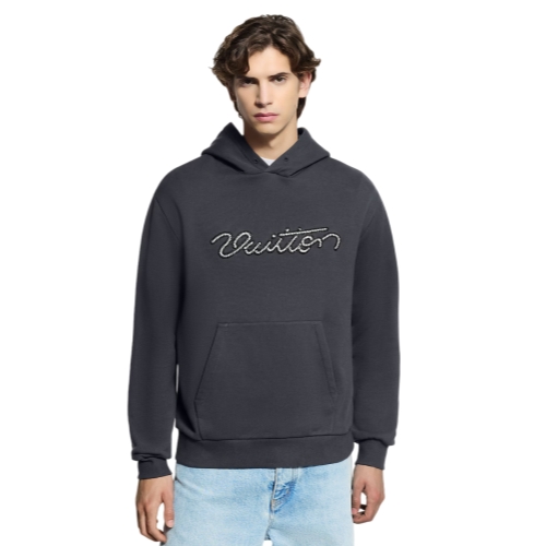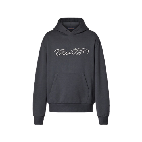 This timeless hoodie comes in a refined dark gray hue that is easy to mix and match. Crafted from certified organic cotton, it is elevated with delicate Vuitton lettering applied with sophisticated beaded embroidery across the chest. This is an essential mid-season piece.