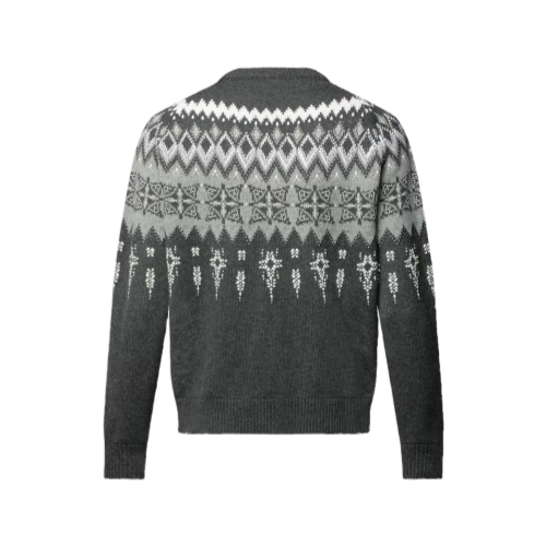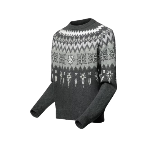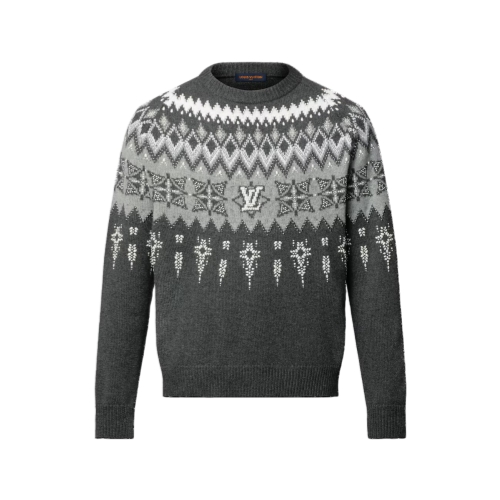 This cashmere-wool blend pullover is a sophisticated option for chic après-ski moments after an active day on the slopes. It features a wintery LV Fair Isle motif in elegant gray tones, which is elevated allover with pearlescent and silver-toned beads reminiscent of glittering snow. This refined piece brings a distinctive twist to any winter resort looks.