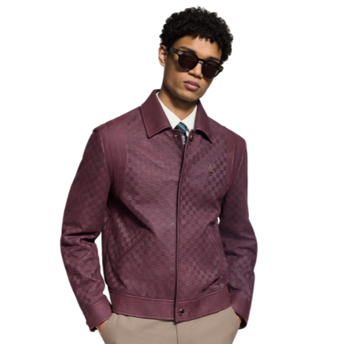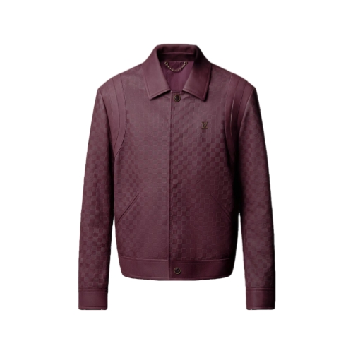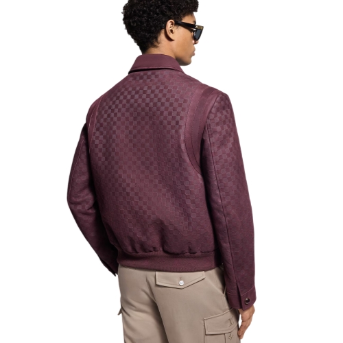 This distinguished leather blouson in rich autumnal burgundy tones is adorned with an embossed allover Mini Damier motif incorporating Marque L.Vuitton Déposée signatures. Tone-on-tone inserts around the shoulders draw on this collection’s sporty collegiate inspiration, while an enameled metal LV ornament adorns the chest and jacquard Monogram elements sign the ribbed waist at the back.