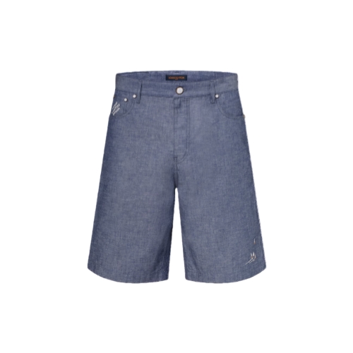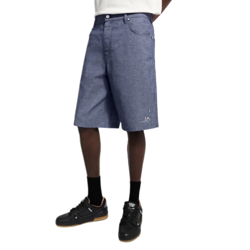 These summery chambray shorts are adorned with an LV Regatta motif inspired by the bustling ports of this collection’s cruise. Intricately embroidered sailing boats appear on the bottom left leg and cluster on the back right pocket into an LV. Marque L.Vuitton Déposée embroidery adorns the ticket pocket while a Damier nubuck jacqueron signs the back. A matching shirt makes a charming set.