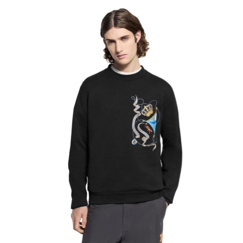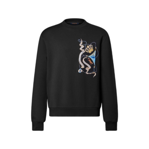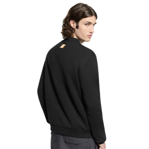 This timeless black long-sleeved sweatshirt is elevated with this collection’s LV Emblem motif, whose vibrant colors and noble symbols rich in House signatures are exquisitely embroidered in lustrous yarn on the chest. This chic twist on a classic silhouette brings a festive and sophisticated mood to a casual look.