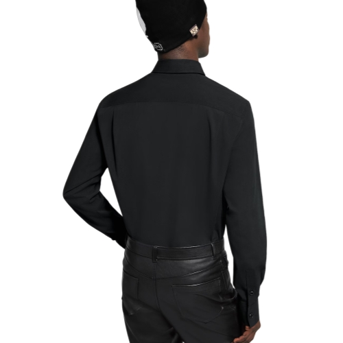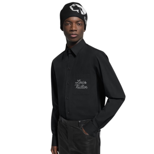 This chic black long-sleeved shirt is tailored from a luxurious blend of cotton and silk. An embroidered Louis Vuitton signature in an elegant cursive script adorns the chest pocket with contrasting pearly white beads, while black buttons in golden settings add a smart finishing touch. This timeless piece is perfect for completing a sophisticated ensemble.
