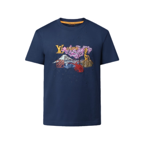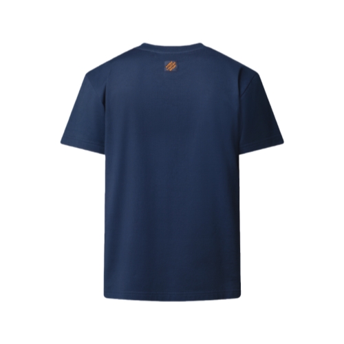 This navy blue organic cotton T-shirt is adorned with an embroidered motif from the Fall-Winter 2025 collaboration between Pharrell and Nigo. The vibrant landscape treatment, worked in a range of stitches, combines references to Nigo’s Japanese cultural heritage with playful House signatures. Tone-on-one Monogram embroidery beneath the motif creates a richly textured effect.