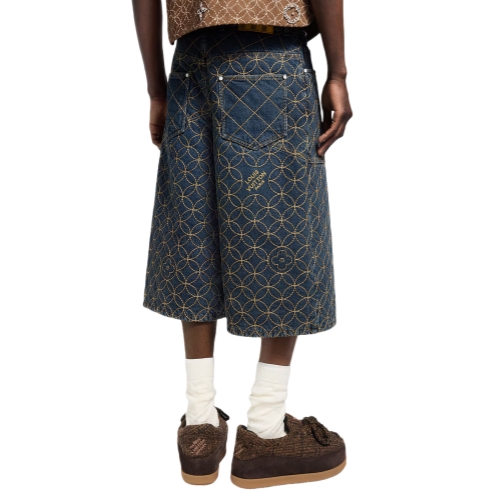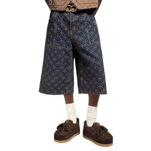 These exclusive denim shorts from the Fall-Winter 2025 show’s collaboration between Pharrell and Nigo showcase Louis Vuitton savoir-faire. They are adorned with a Dandy Monogram motif that draws on Nigo’s Japanese heritage, which is seamlessly embroidered all over in contrasting tobacco yarn with incorporated Louis Vuitton signatures. Pearly rivets add a chic finishing touch to this runway piece, which has a matching jacket.
